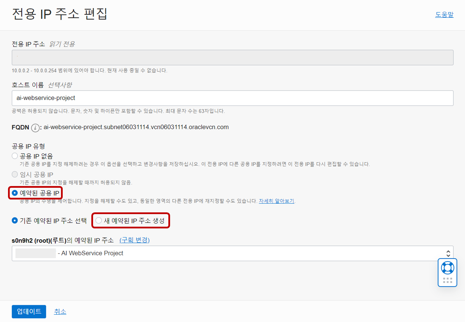 - 다시 편집을 들어가서 이번에는 예약된 공용 IP - 새 예약된 IP 주소 생성 을 클릭하고 업데이트 해준다.