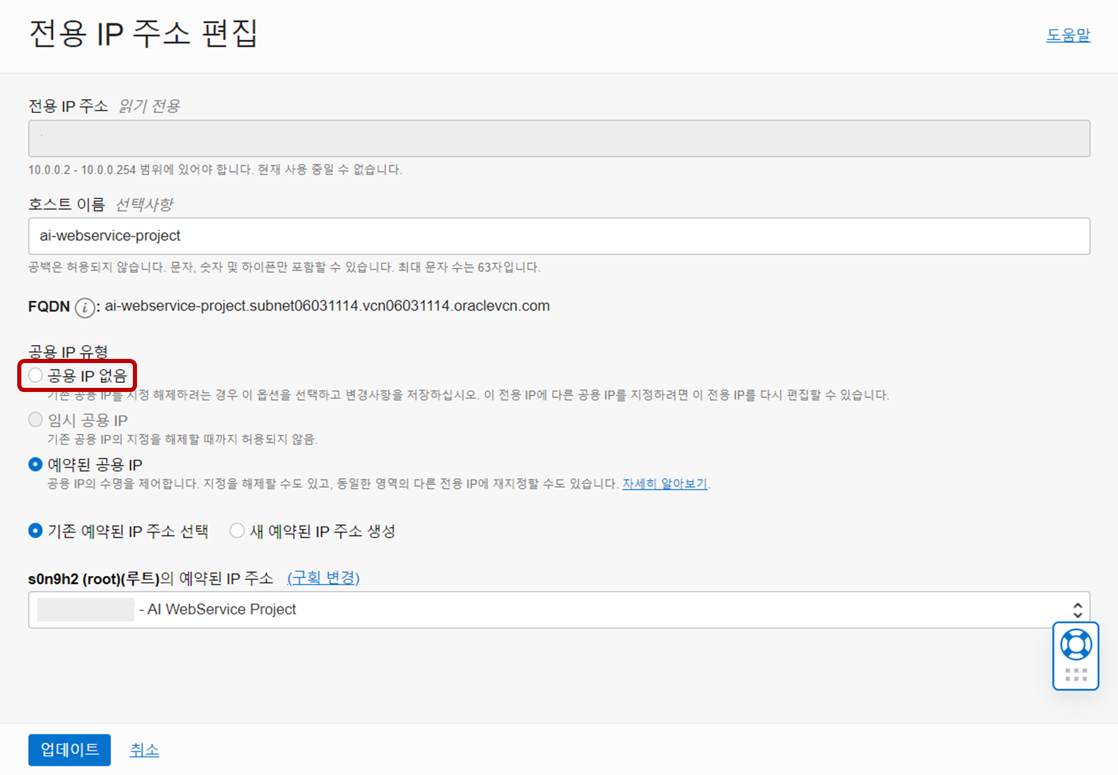 - 그리고 현재 할당되어 있는 유동 IP를 해제하기 위해 공용 IP 없음 을 선택하고 업데이트 한다.