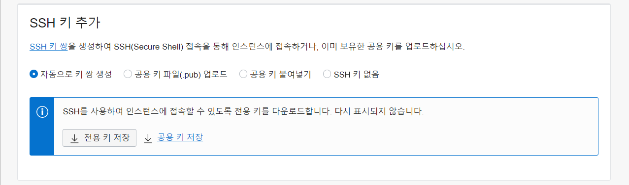 - 다음 단계에서 많이 고민했는데 보안성을 위해서는 "공용 키 붙여넣기"가 가장 좋다고 했지만 별도의 프로그램이 필요하길래 그냥 "자동으로 키 쌍 생성"을 이용했다.