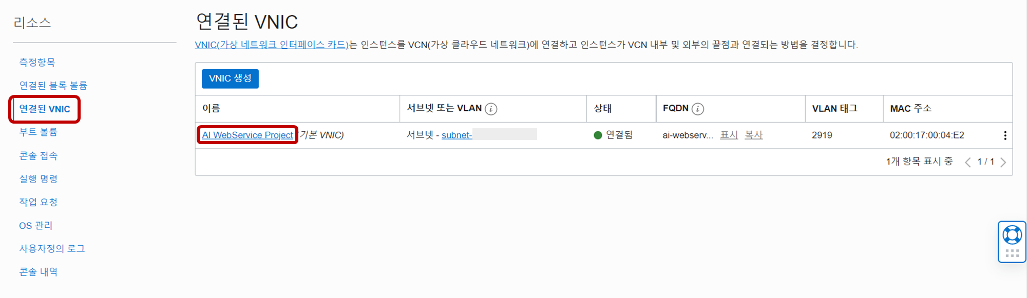 - 컴퓨트 - 인스턴스 - 인스턴스 세부정보에서 연결된 VNIC 를 클릭한다.