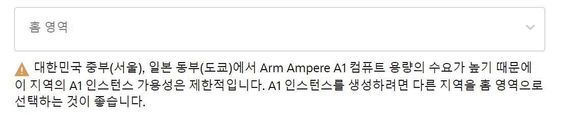 - 회원가입 단계에서 가장 중요한 점은 리전을 잘 선택해야 한다는 것이다. 프리티어의 경우 가입 이후 리전을 바꿀 수 없기 때문에 신중하게 선택해야 한다. 그런데 보통 아래 경고가 뜨는 지역은 현재 E1 인스턴스를 생성하지 못하는 곳이므로 그 지역들만 피해서 고르면 된다.