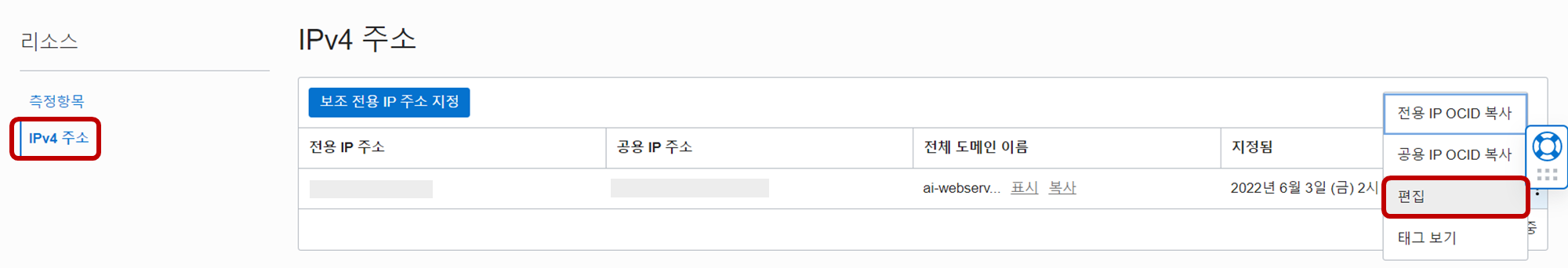 - 왼쪽에서 IPv4 주소를 클릭하고 오른쪽 끝의 점 세 개 - 편집 을 선택한다.